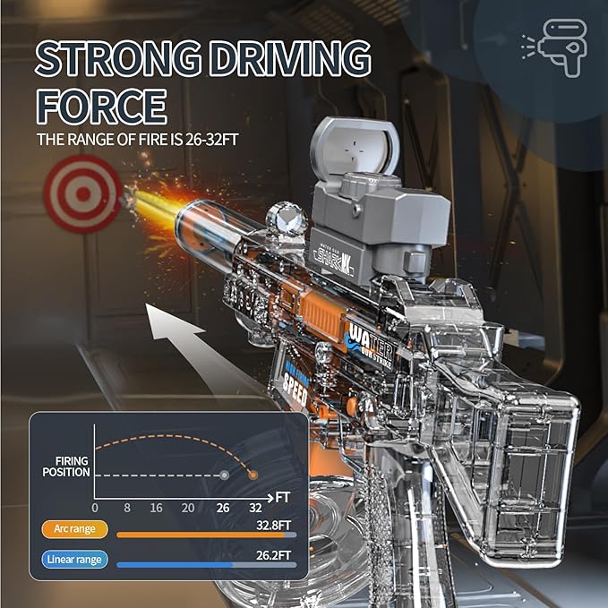 The water gun is rechargeable via lithium battery and USB cable, ensuring long-lasting performance. Made from durable, child-safe materials, it encourages active play, coordination, and strategy skills while providing hours of entertainment.